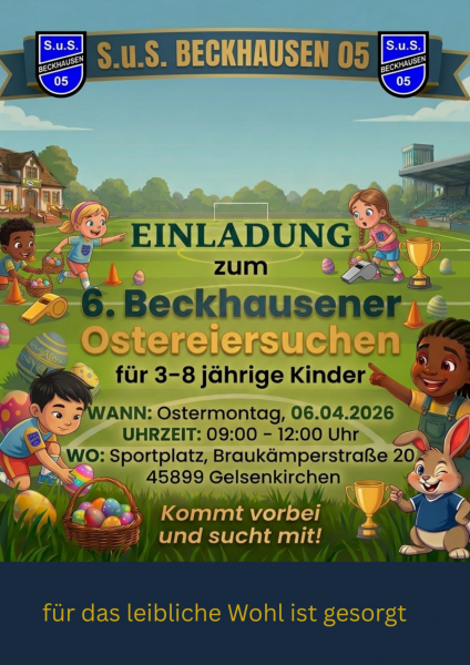 Der S.u.S. Beckhausen 05 lädt auch in diesem Jahr wieder alle kleinen Osterfans herzlich zum traditionellen Ostereiersuchen ein! 🎉